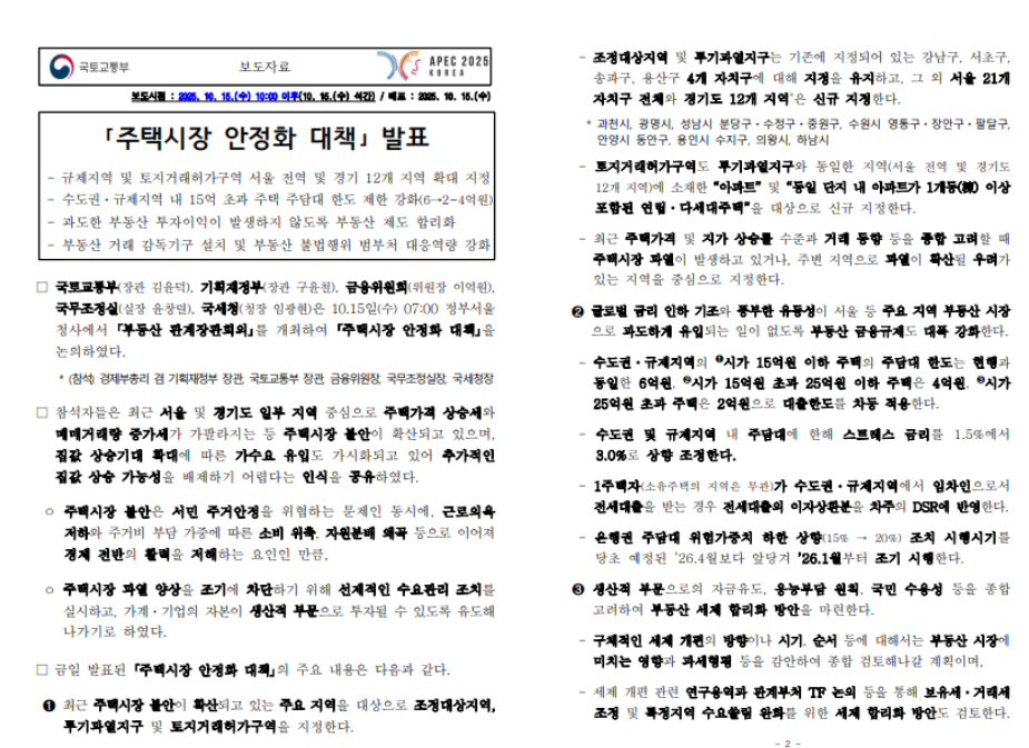 - **LTV(담보인정비율)**도 비규제지역은 최대 70%, 규제지역은 **최대 50%**로 제한됩니다.